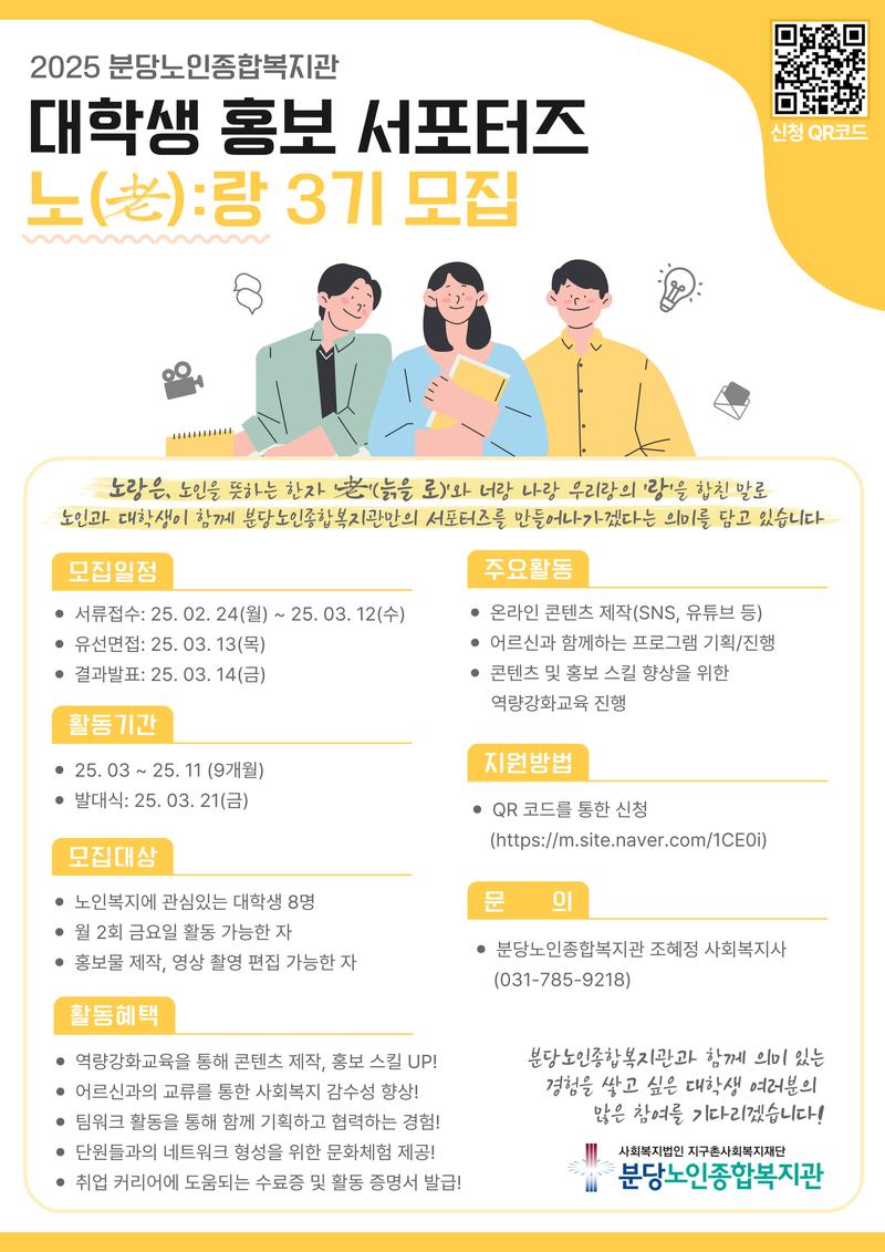 분당노인종합복지관에서 대학생 홍보 서포터즈 노(老):랑 3기 모집합니다.