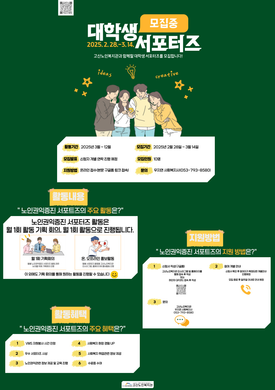 고산노인복지관에서는 전문적인 기획 및 진행 활동에 관심이 있는 대학생을 대상으로 노인권익증진 서포터즈 1기를 모집하고 있습니다!