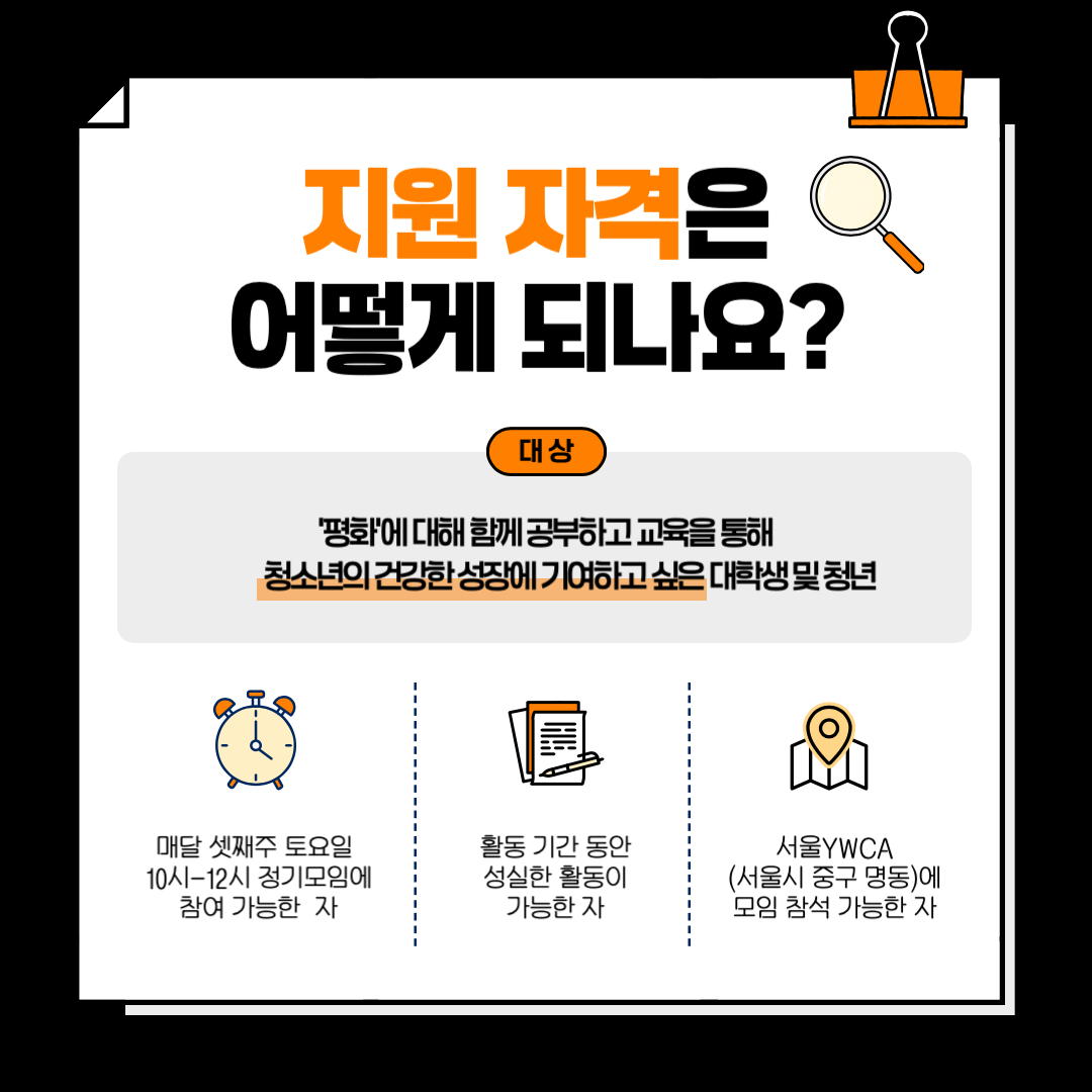 ▷모집 대상 : ‘평화’에 대해 함께 공부하고 교육을 통해 청소년의 건강한 성장에 기여하고 싶은 대학생 및 청년