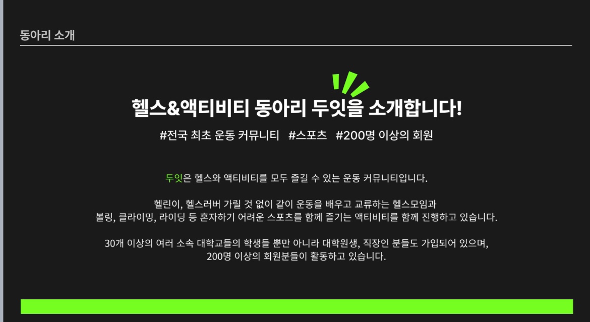 본인이 원하는 액티비티 or 헬스모임을 열 수 있는 두잇 크루 분들도 모집하구 있어요! 다양한 혜택이 제공되는 두잇 크루에 많이 지원해주세요❤(두잇 크루로 지원하는 분들은 자동적으로 두잇 회원으로도 지원되서 지원서를 2개 쓸 필요가 없어요!)