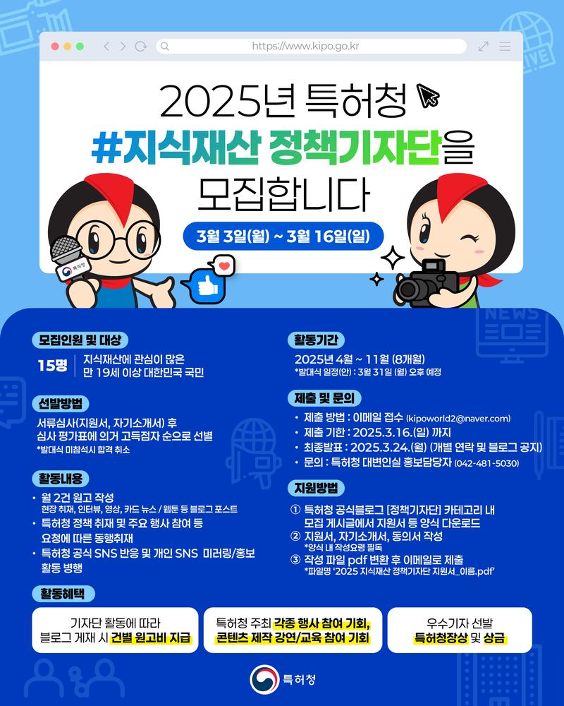 #특허청 #지식재산 #정책기자단 #블로그기자단 #청년기자단 #2025모집 #현장취재 #콘텐츠제작 #기자단지원
