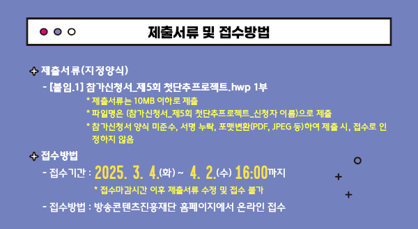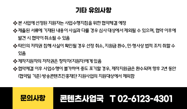 - 제작지원작품 완성 시 방송콘텐츠진흥재단 지원 사실을 크레딧에 명시해야 함