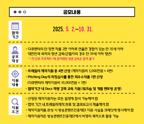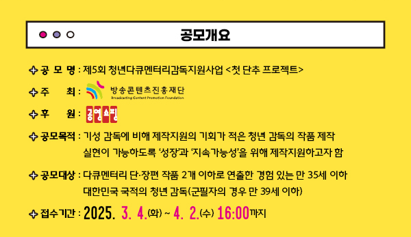 - 다큐멘터리 단·장편 작품 2편 이하로 연출한 경험이 있는 만 35세 이하 대한민국 국적의 청년 감독(군필자의 경우 만 39세 이하)