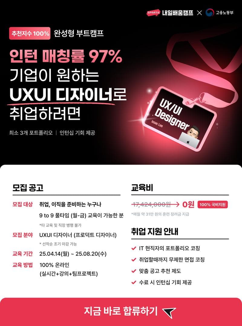 4개월 뒤, 경쟁력 있는 디자이너로 취업 성공이 가능한 <UX/UI 디자이너> 7기 모집 시작되었습니다. ✨