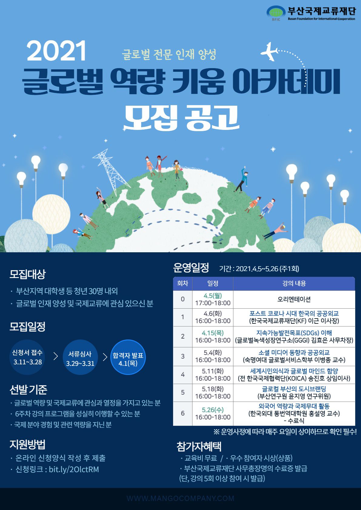 부산국제교류재단은 부산지역 대학생 등 청년들을 대상으로 차세대 글로벌 리더 양성 및 국제 분야 진출 지원을 위해 아래와 같이 '글로벌 역량 키움 아카데미' 참가자를 모집합니다. 글로벌 인재가 갖추어야 할 필수 역량 및 소양을 중심으로 6회차의 강의가 진행될 예정입니다😊