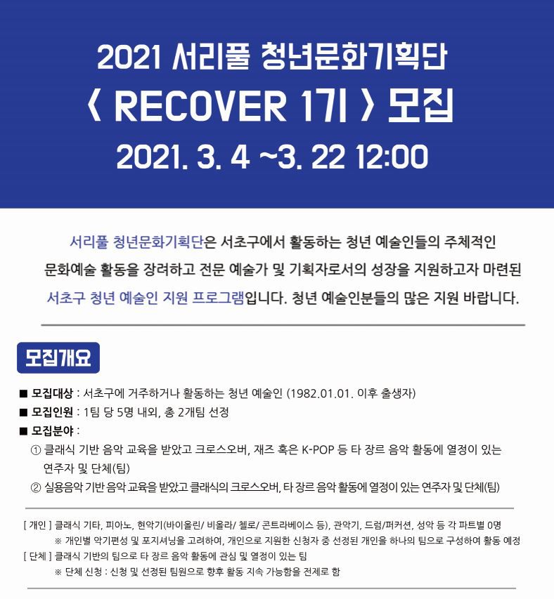 서초문화재단 2021 서리풀 청년문화기획단 RECOVER 1기 모집