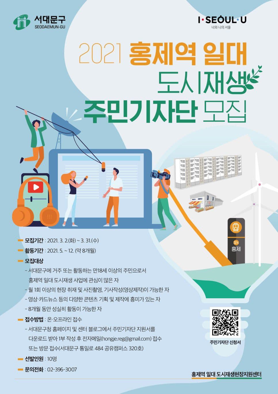 주민기자단은 홍제역 일대에서 진행되고 있는 다양한 도시재생사업을 현장에서 취재하고, 숨은 이야기와 다양한 삶의 모습을 발굴해 널리 소개하는 역할을 하게 됩니다. 주민주도의 창조적 도시재생을 통해 홍제역 일대의 가치와 매력을 높일 주민기자단 모집에 많은 지원을 바랍니다.