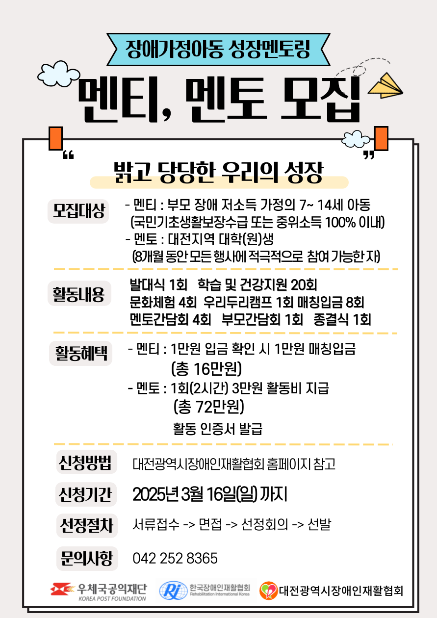 우체국공익재단의 지원을 받아 한국장애인재활협회 주관, 공동수행기관으로 2008년부터 사업을 진행하고 있습니다. 부모님이 장애가 있는 가정의 7 ~ 14세 아동과 주 1회 1:1 일상 및 학습, 문화체험을 통해 밝고 당당한 성장 지원을 함께할 재능 기부자님을 모집합니다. 많은 관심과 참여 부탁드립니다. 감사합니다.