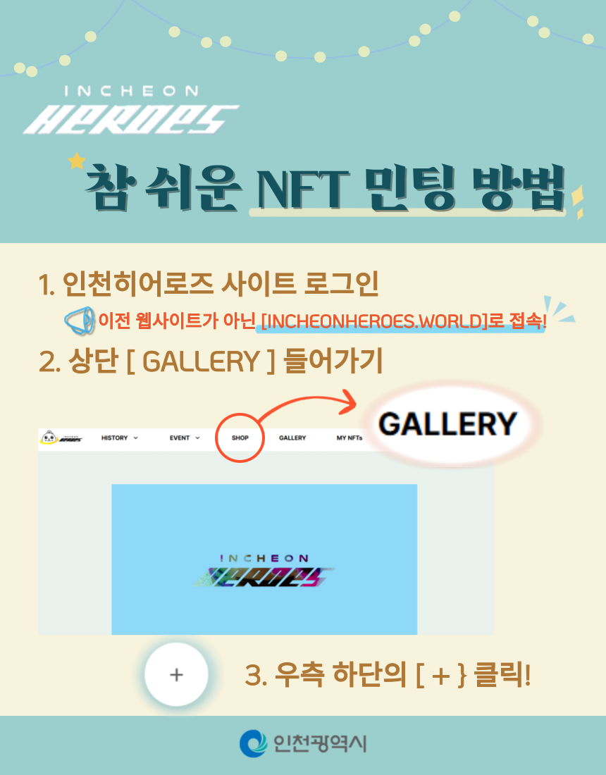 2️⃣ 간편하게 NFT 민팅하기: 인천히어로즈 웹사이트 로그인 - Gallery - +버튼 클릭!