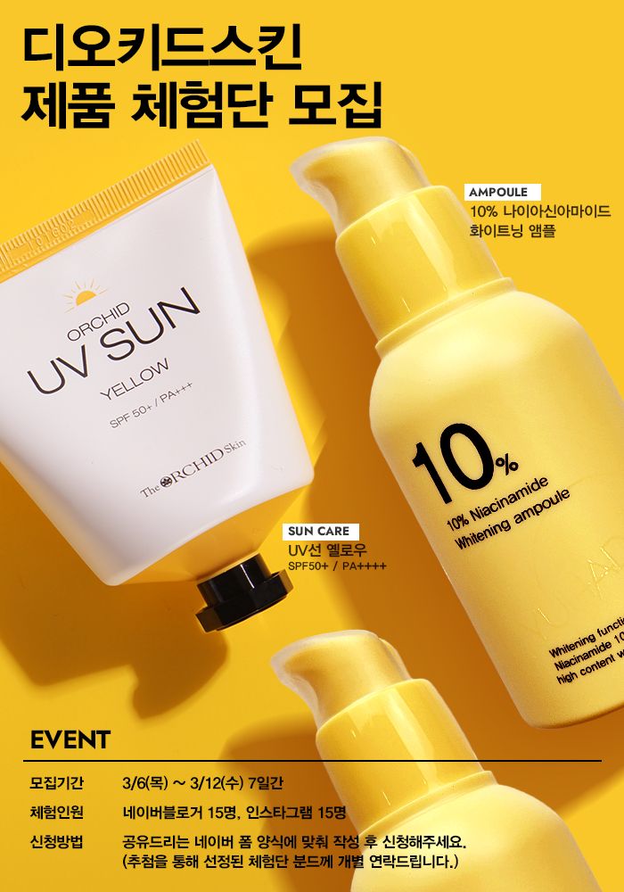 디오키드스킨의 세컨브랜드 유하다(YUHADA)의 UV선크림옐로우 & 물 타지않은 진짜 앰플3종 서포터즈를 모집합니다.