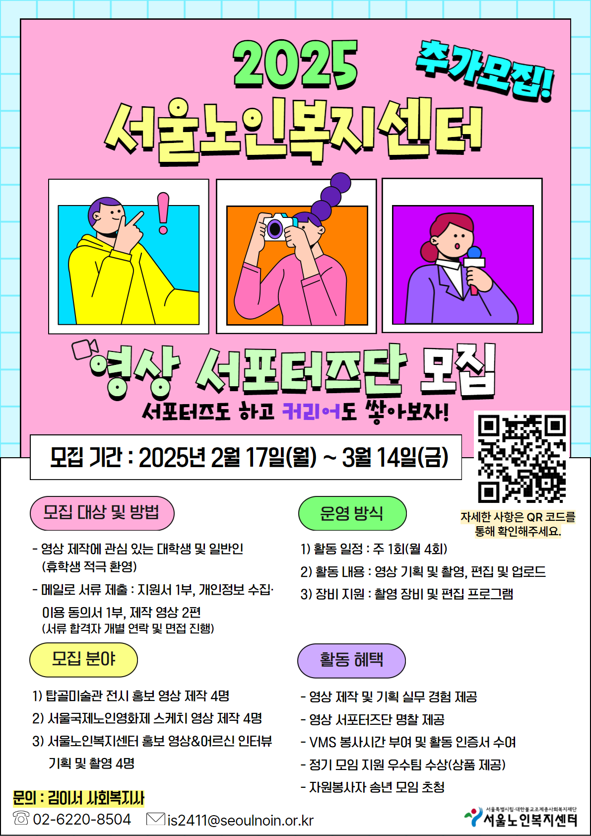 2) 이전 제작 영상 (포트폴리오) 1~2편과 함께 메일 제출 (is2411@seoulnoin.or.kr)