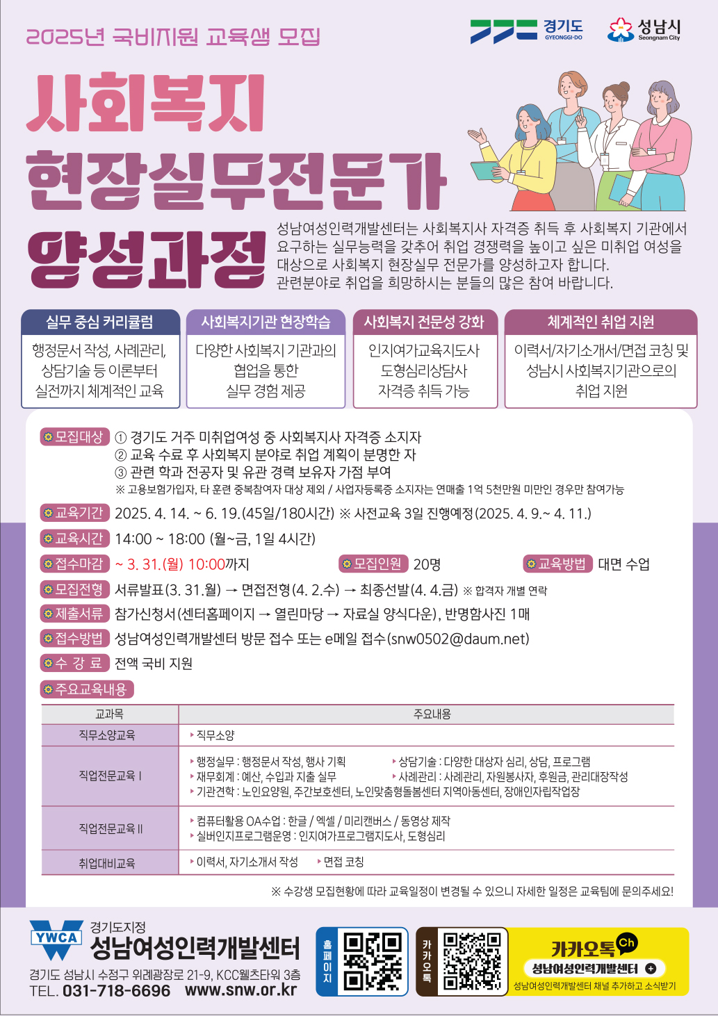 사회복지사 자격증 취득 후, 경력이 없거나 경력이 단절되어 사회복지 분야로 취업이 어려운 여성분들을 대상으로 사회복지 행정 및 현장 실무 경험을 쌓고 전문성을 강화시켜 취업을 지원하고자 하오니 관련 분야로 취업을 희망하는 분들의 많은 참여 바랍니다.