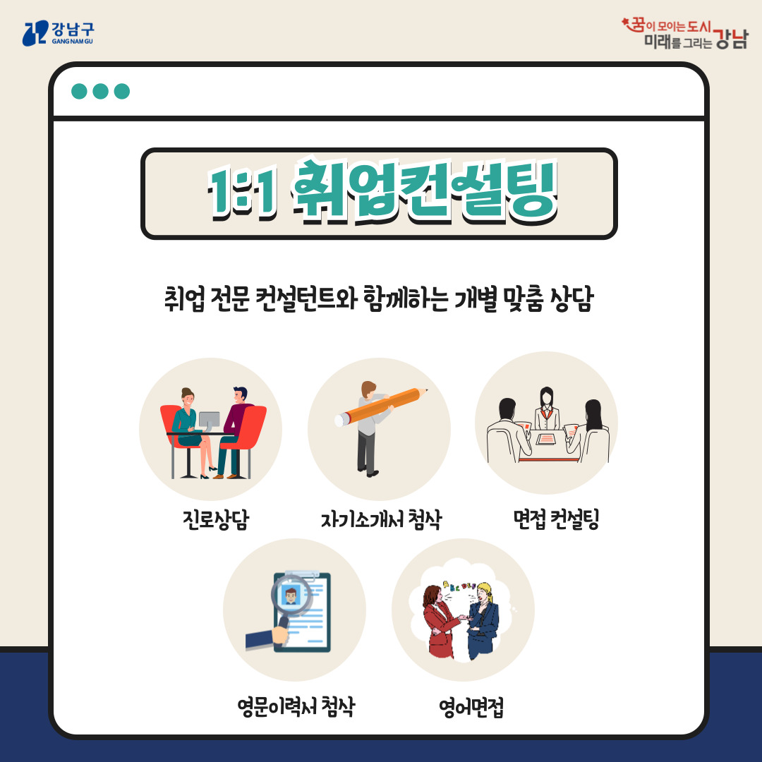 진로상담, 입사서류 첨삭(국/영문), 면접 컨설팅(국/영문) 중 선택 가능한 1:1 취업컨설팅