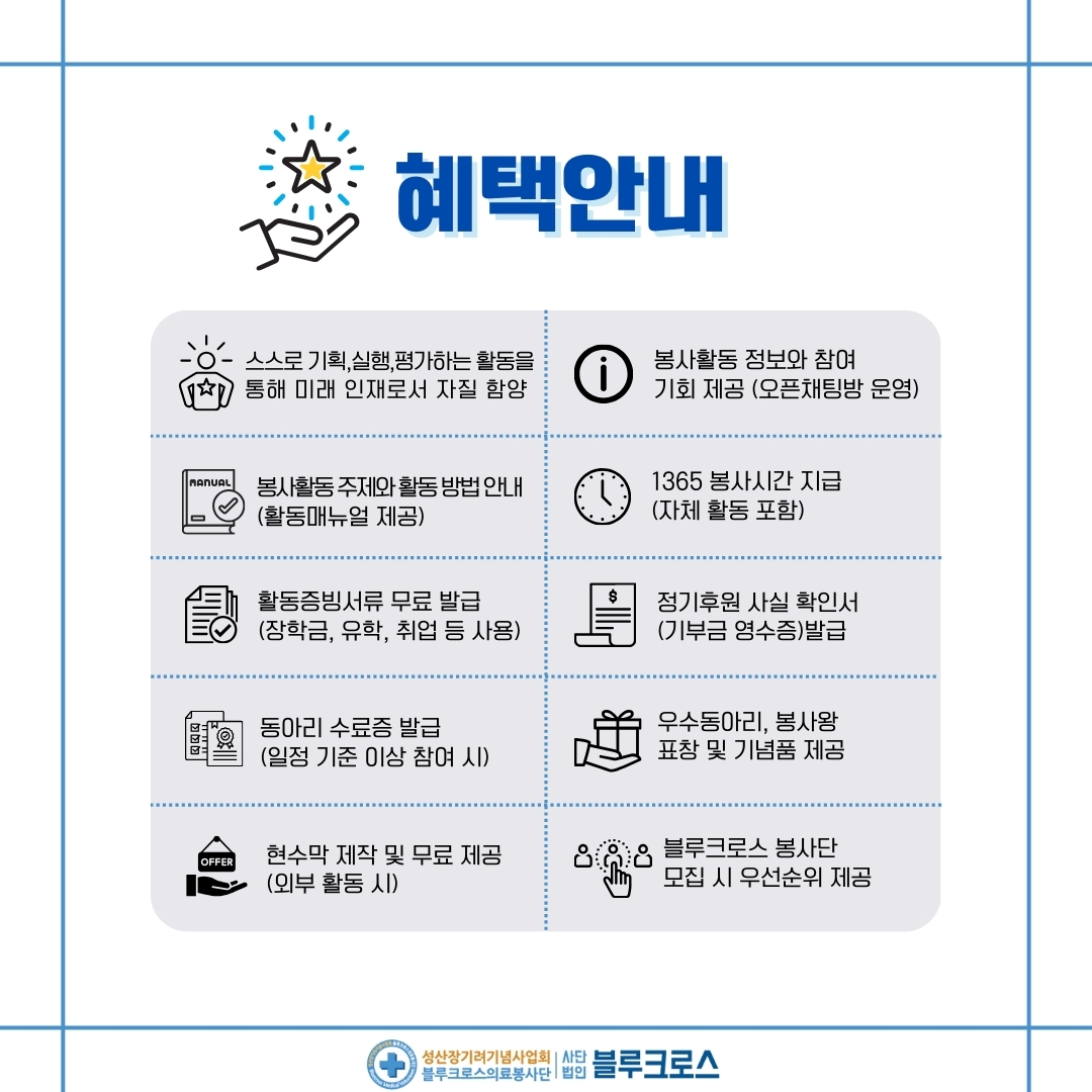 올해는 대학부까지 동아리 활동의 범위를 확장하여 다양한 봉사활동 참여는 물론 각 학교의 동아리들이 갖는 독특하고도 자체적인 봉사활동을 기획하고 실행하고 지원함으로써 그들의 진로(꿈과 비전)에 도움을 드리고자 합니다.
