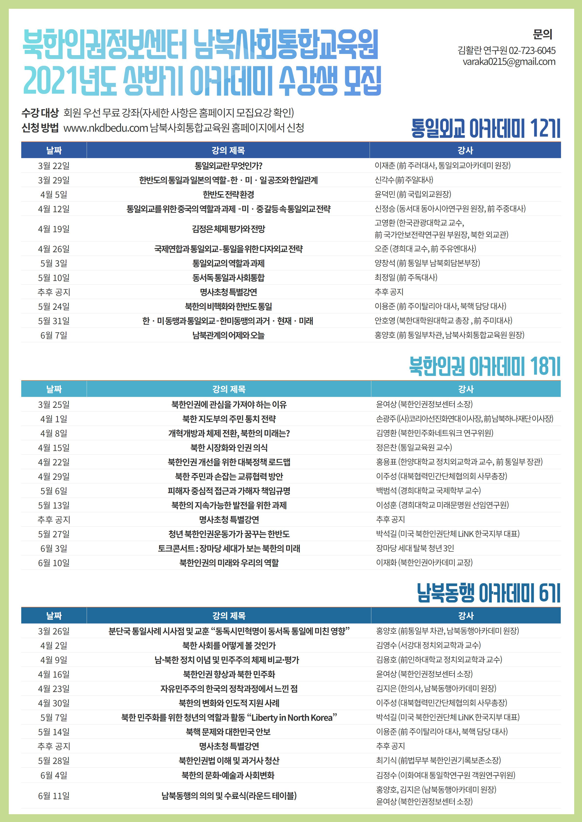 (사)북한인권정보센터 남북사회통합교육원에서 2021 상반기 개강할 5개 아카데미의 수강생을 모집합니다. 남북사회통합교육원은 일반 시민을 대상으로 북한 인권에 대한 관심을 제고하며, 남북사회통합에 필요한 균형 잡힌 교육을 제공함으로써 다가오는 통일 시대를 이끄는 핵심 인력을 양성하고 있습니다.