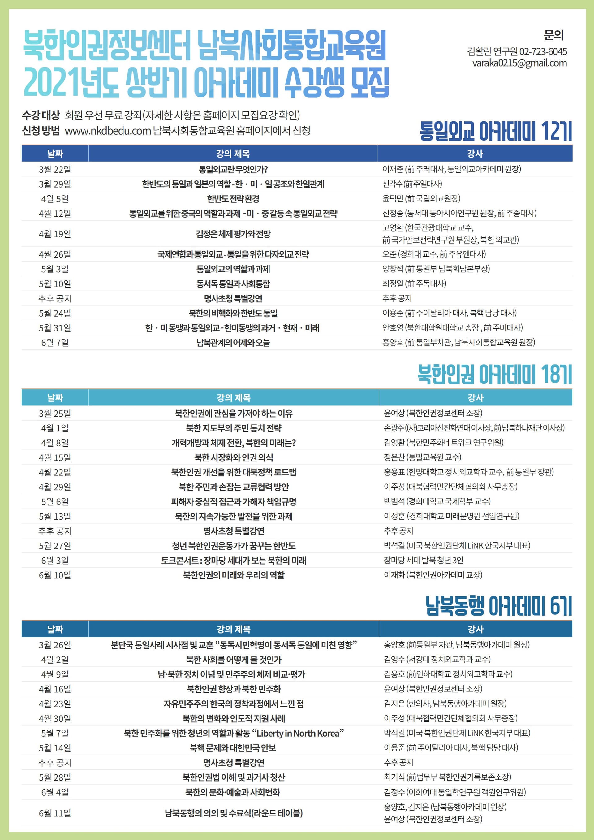 금년 봄, 특별하고 뜻 깊은 아카데미 강좌에 통일에 대한 관심과 열정을 가진 여러분들을 초대합니다! 자세한 내용은 북한인권정보센터 홈페이지(www.nkdb.org)와 남북사회통합교육원 홈페이지(www.nkdbedu.com)에서도 확인하실 수 있습니다. 많은 관심 부탁드립니다.