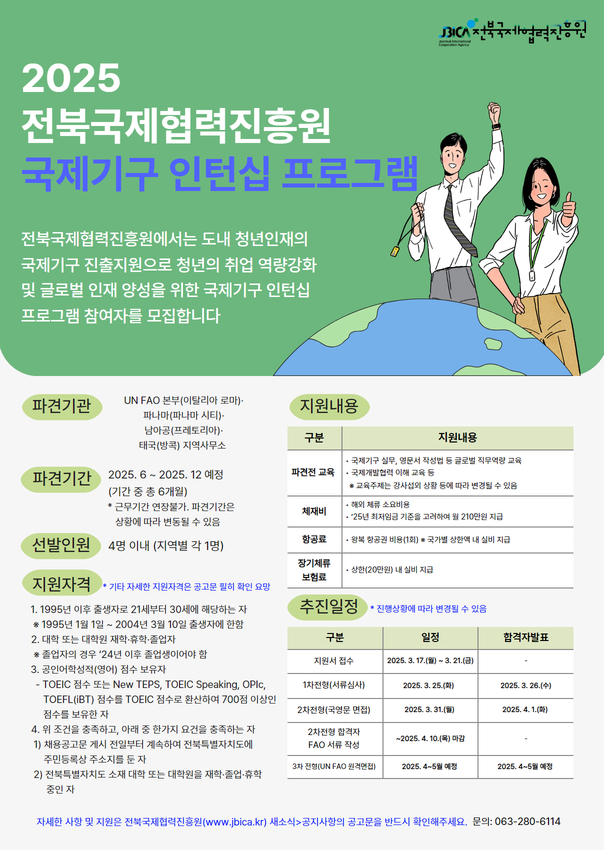 전북국제협력진흥원에서 2025 국제기구 인턴십 프로그램 참가자를 모집하오니,