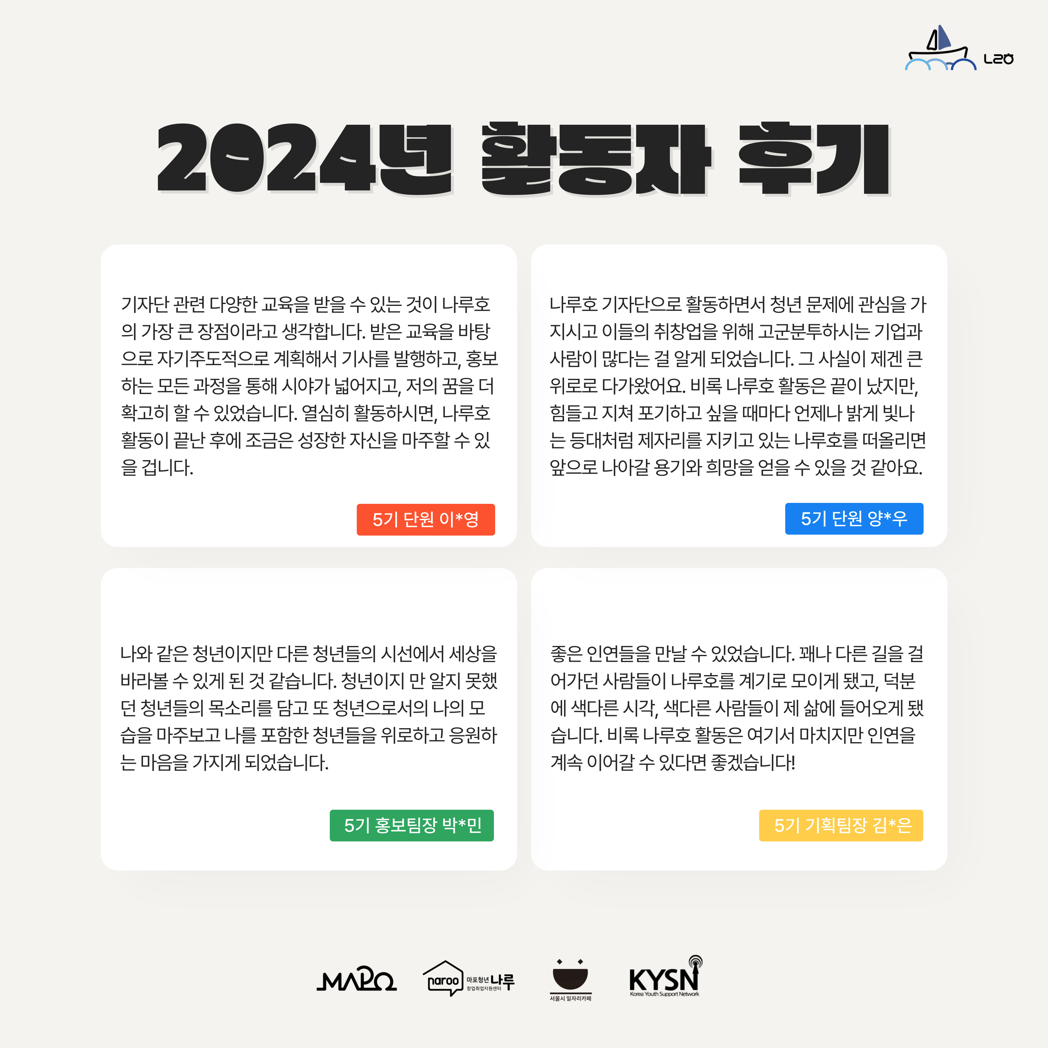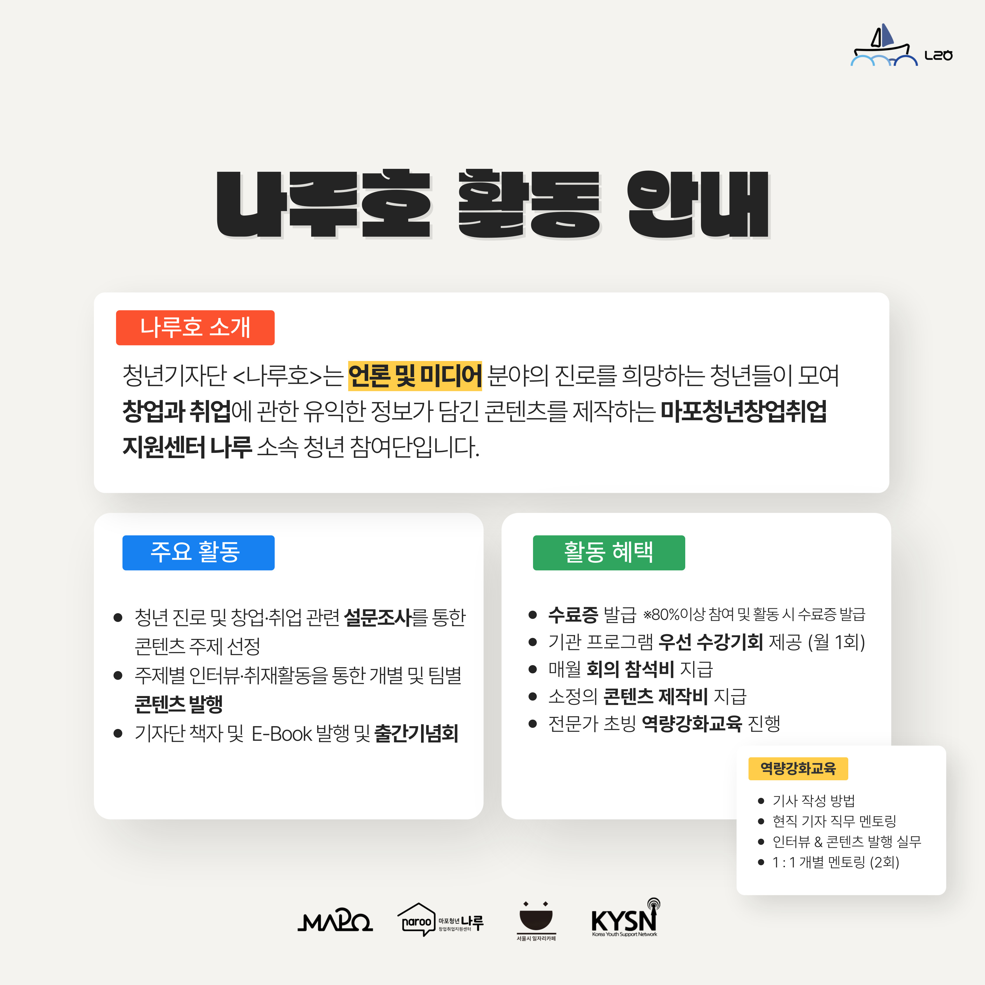 청년기자단 <나루호>는 언론 및 미디어 분야의 진로를 희망하는 청년들이 모여 창업과 취업에 관한 유익한 정보가 담긴 콘텐츠를 제작하는 마포청년창업취업지원센터 나루 소속 청년 참여단입니다.