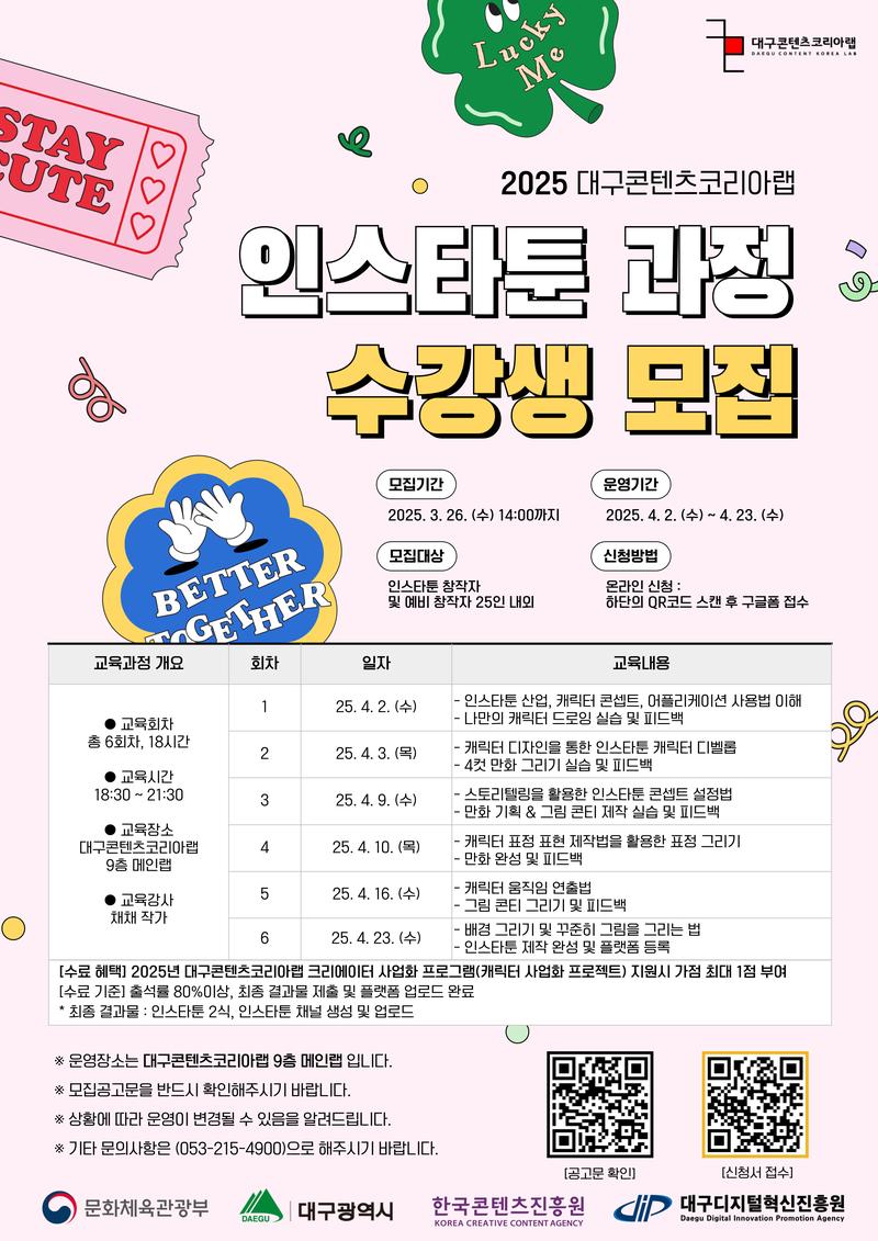 (재)대구디지털혁신진흥원에서는 2025년 대구콘텐츠코리아랩 운영사업의 일환으로 크리에이터 아카데미 인스타툰 과정 참가자를 모집하고자 하오니, 많은 관심과 신청 바랍니다.