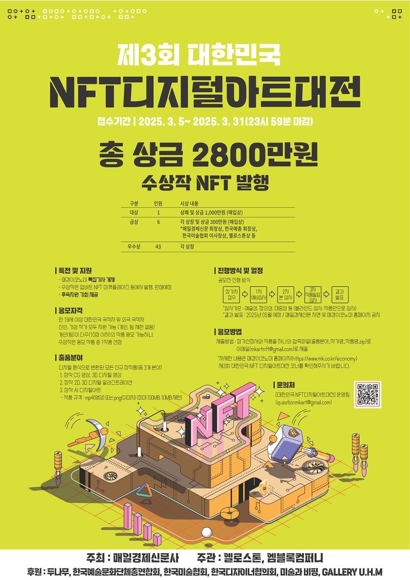 일정과 시상 내용은 일부 변경될 수 있으며 변경사항 포함 모든 공지 및 결과 발표 안내는 매경이코노미 홈페이지(https://www.mk.co.kr/economy/) 제3회 대한민국 NFT 디지털아트대전 코너를 통해 이뤄집니다.