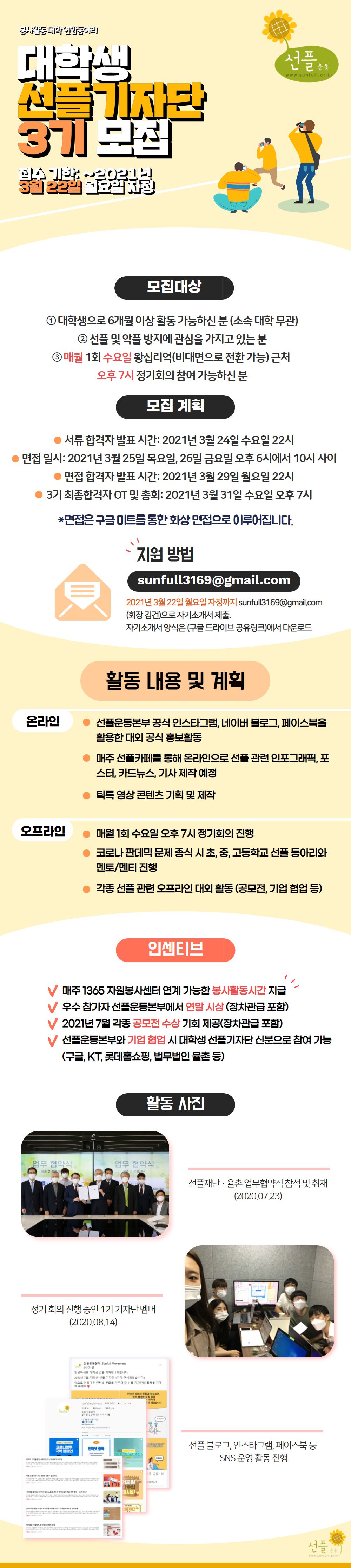선플운동본부는 지난 14년간 인터넷상에서 악플과 혐오 표현, 인권침해 예방을 위한 청소년 인권교육과 캠페인 활동을 펼쳐온 비정치, 비종교, 비영리 민간단체입니다. 선플운동본부는 아름다운 인터넷 문화를 만들기 위한 선플 관련 저널리즘 활동 및 SNS 홍보를 활성화하기 위해 대학생 선플기자단 3기를 모집합니다.