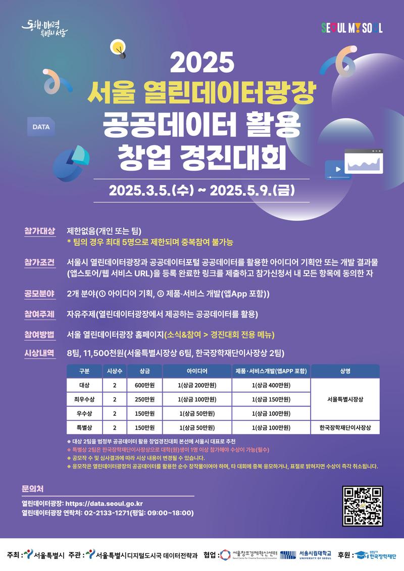 자세한 사항은 공고문(2025 서울 열린데이터광장 공공데이터 활용 창업경진대회)를 확인해 보시기 바랍니다.