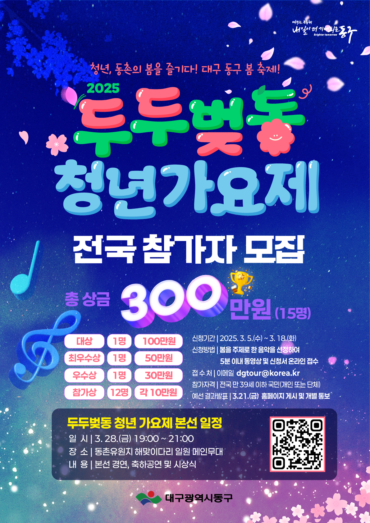 2025년 동구 봄 축제 ‘두두벚동’에서 총 상금 300만원의 두두벚동 청년가요제 참가자를 오는 18일까지 모집합니다. 대구 동구청이 벚꽃 시즌에 맞춰 새로 선보이는 봄 축제 무대를 장식할 전국의 끼 많은 청년들의 적극적인 참여를 바랍니다!