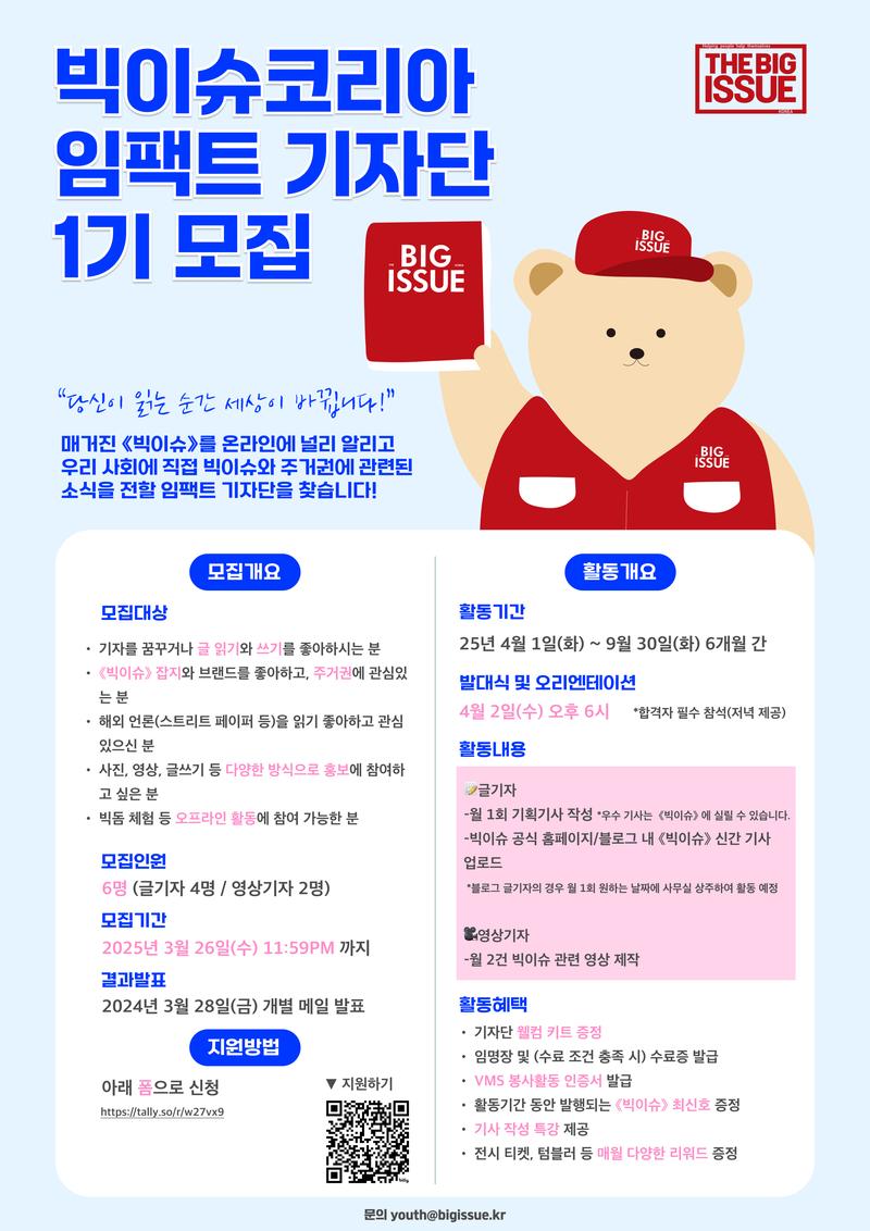 매거진 《빅이슈》를 ‘온라인’에 널리 알리고 우리 사회에 직접 빅이슈와 주거권에 관련된 소식을 전해 크고 작은 임팩트를 만들어낸 [임팩트 기자단] 을 대모집합니다!