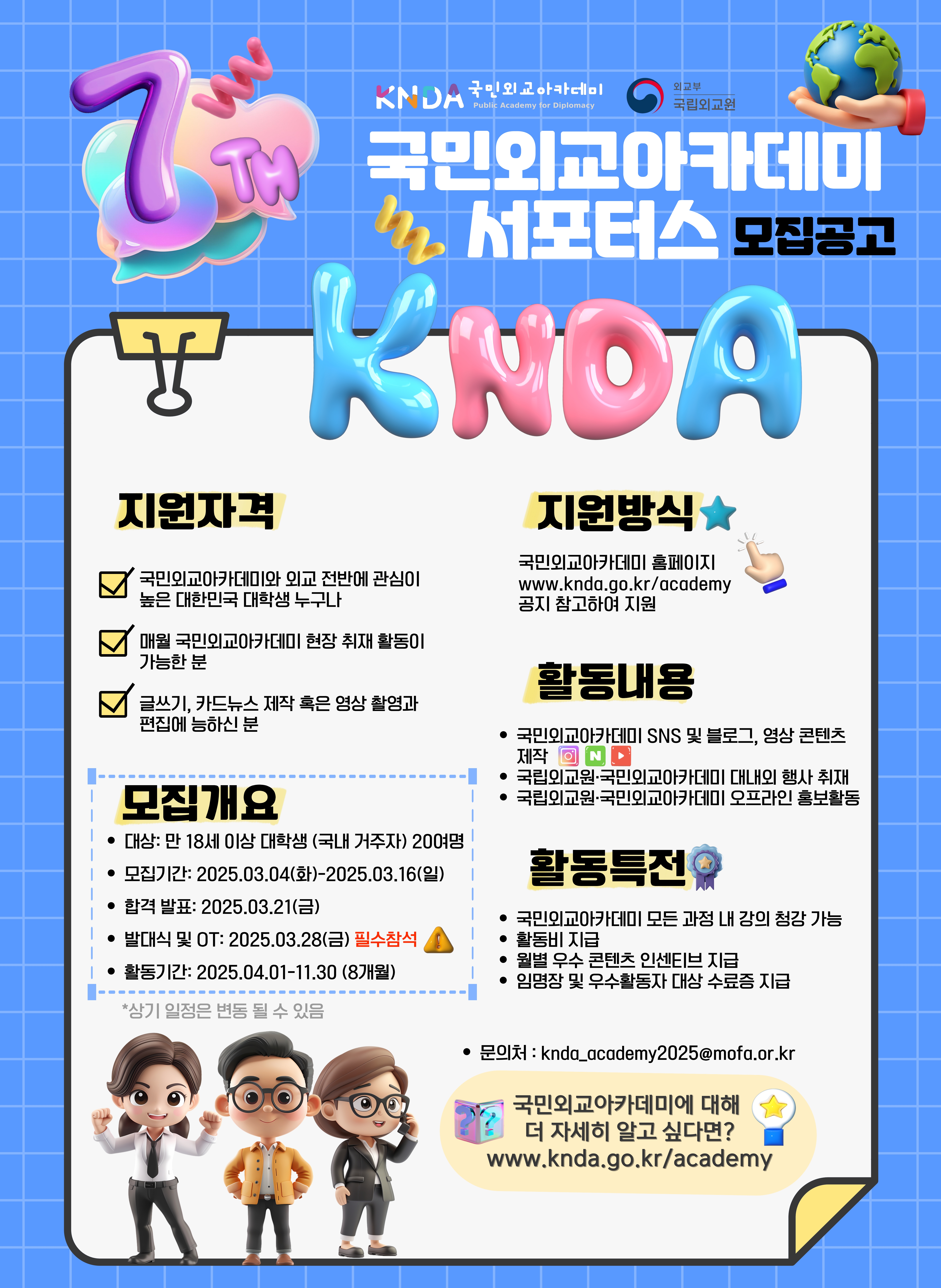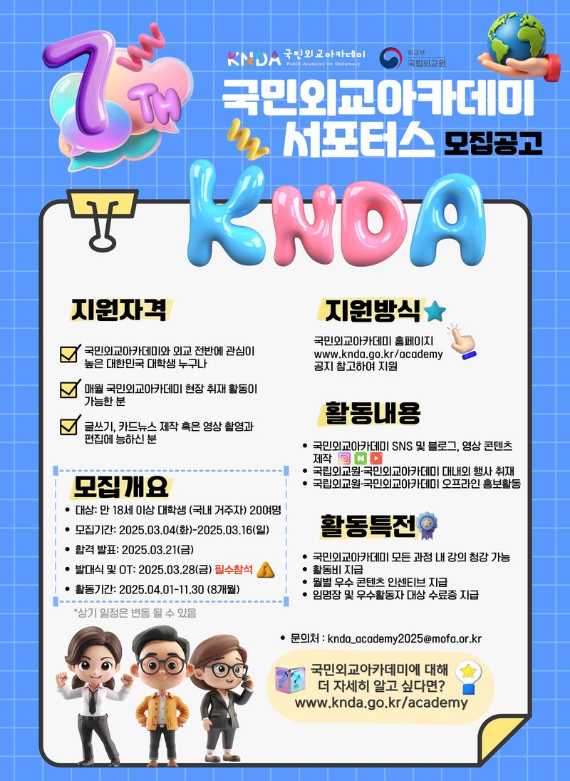 - 국민외교아카데미 홈페이지 www.knda.go.kr/academy 공지 참고하여 지원