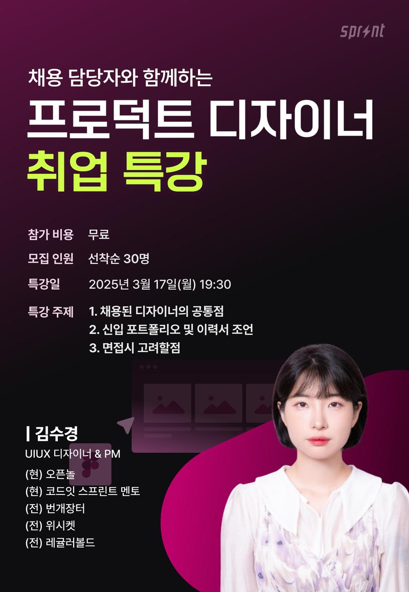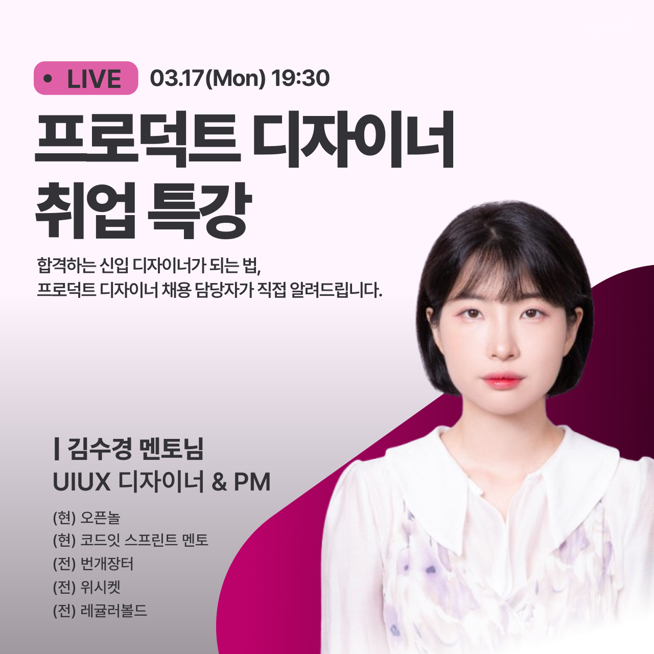 3월 17일 월요일, 현직에서 프로덕트 디자이너 채용을 담당하고 계신 김수경 멘토님의 무료 특강이 진행됩니다.