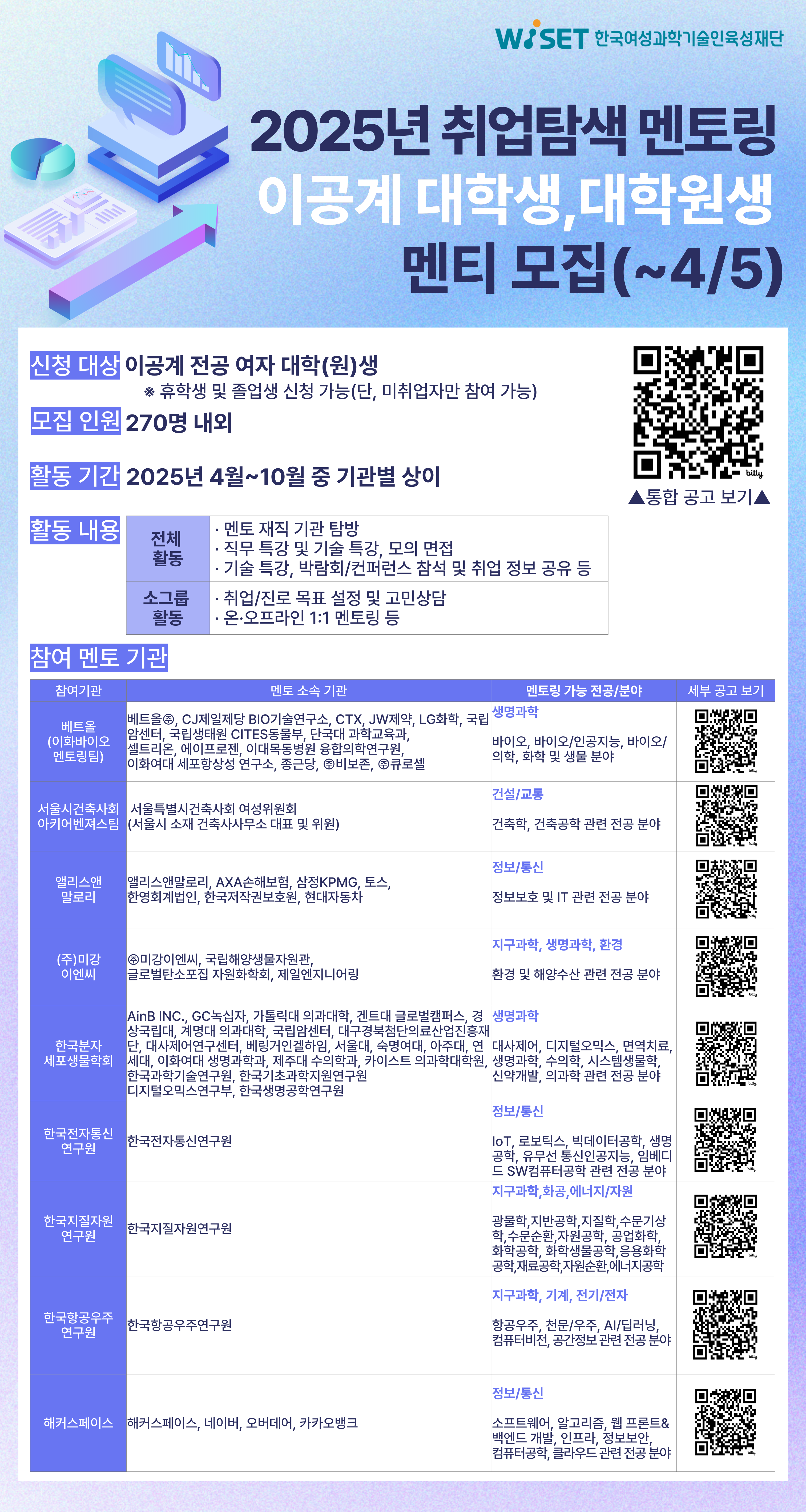 안녕하세요. WISET에서는 과학기술분야 선배와의 멘토링을 통해 취업 및 진로개발, 미래설계의 지원을 받고자 하는 이공계 여자 대학(원)생을 아래와 같이 모집하오니 관심있는 대학생, 대학원생들의 많은 신청 바랍니다.
