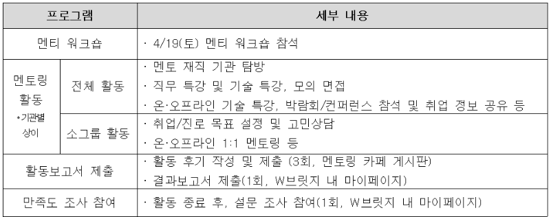 ※ 신청 경로 : W-Bridge(www.wbridge.or.kr) > 네트워킹 > 취업탐색 멘토링 > "기관별 멘토링 신청페이지" 클릭 및 신청