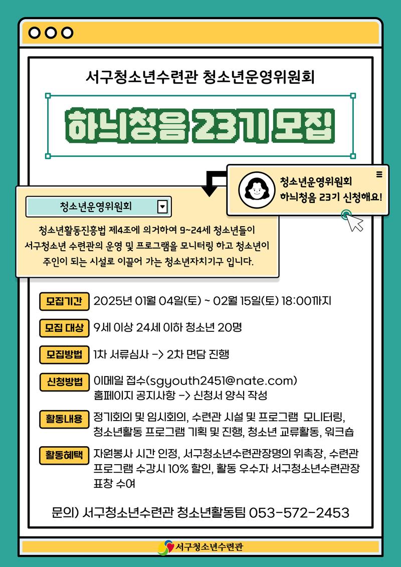 서구청소년수련관에서 함께 활동할 청소년운영위원회 하늬청음 23기 위원을 모집합니다.