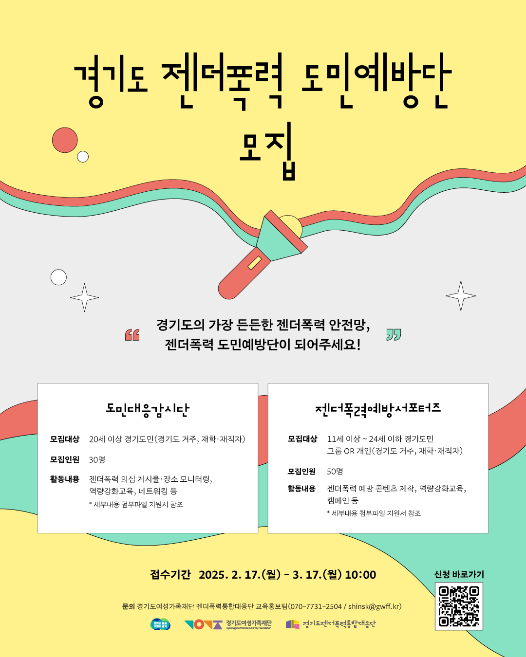 "경기도의 가장 든든한 젠더폭력 안전망, 젠더폭력 도민예방단이 되어주세요!"