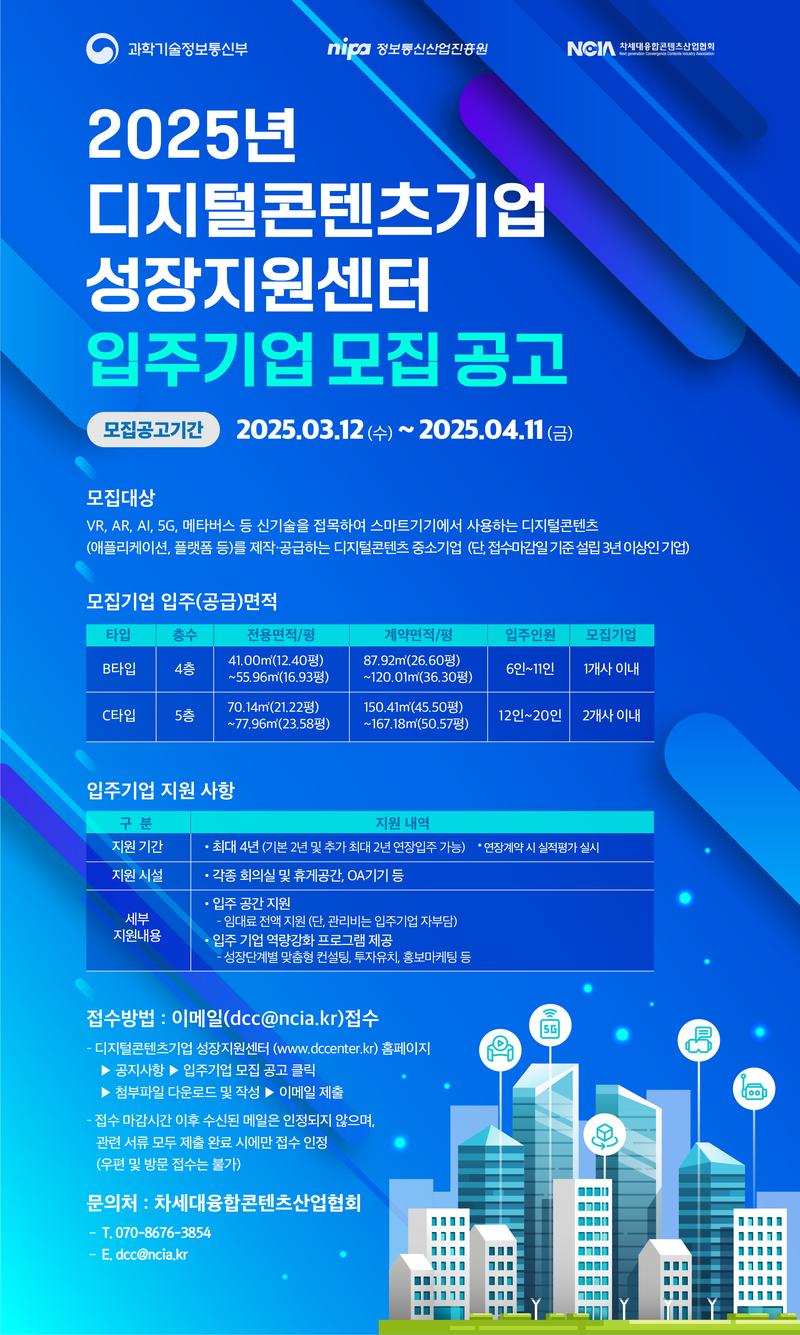 이에, 과학기술정보통신부와 정보통신산업진흥원, 차세대융합콘텐츠산업협회는 디지털콘텐츠기업 성장지원센터 입주기업 모집을 시행하오니, 관련 기업의 많은 관심과 참여바랍니다.