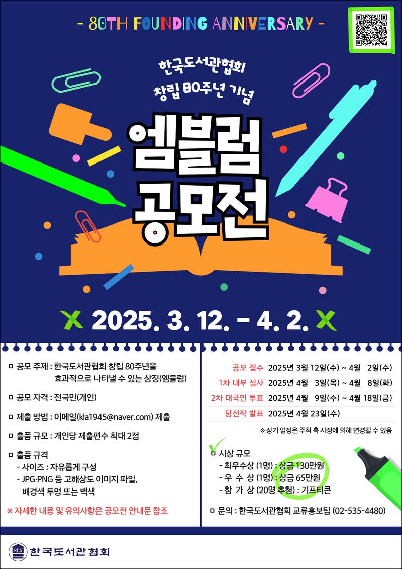 한국도서관협회는 창립 80주년을 맞아 협회의 역사와 성과를 조명하고, 도서관의 가치를 널리 알리기 위해 「한국도서관협회 창립 80주년 기념 엠블럼 공모전」을 개최합니다.