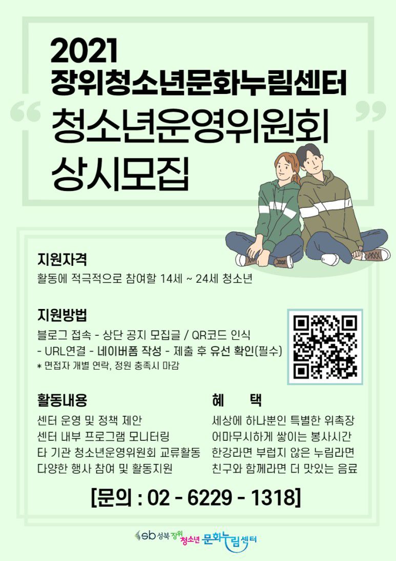 성북구립장위청소년문화누림센터 2021 청소년운영위원회 1기 모집