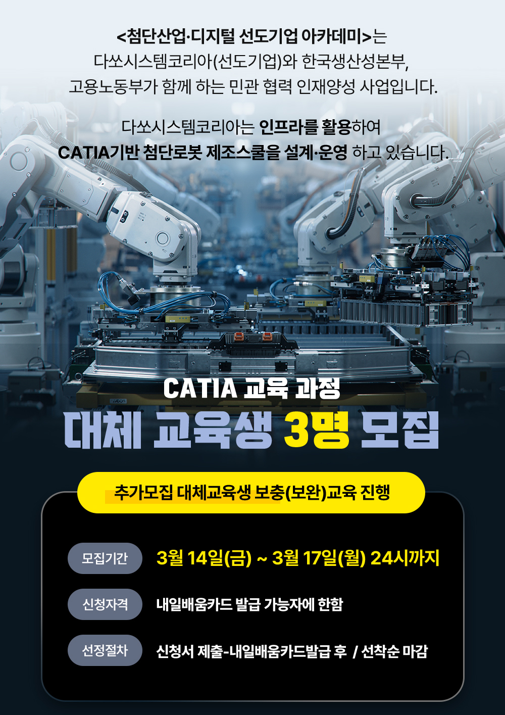 - 모집과정 : [다쏘시스템코리아] 카티아(CATIA) 첨단 로봇제조 스쿨