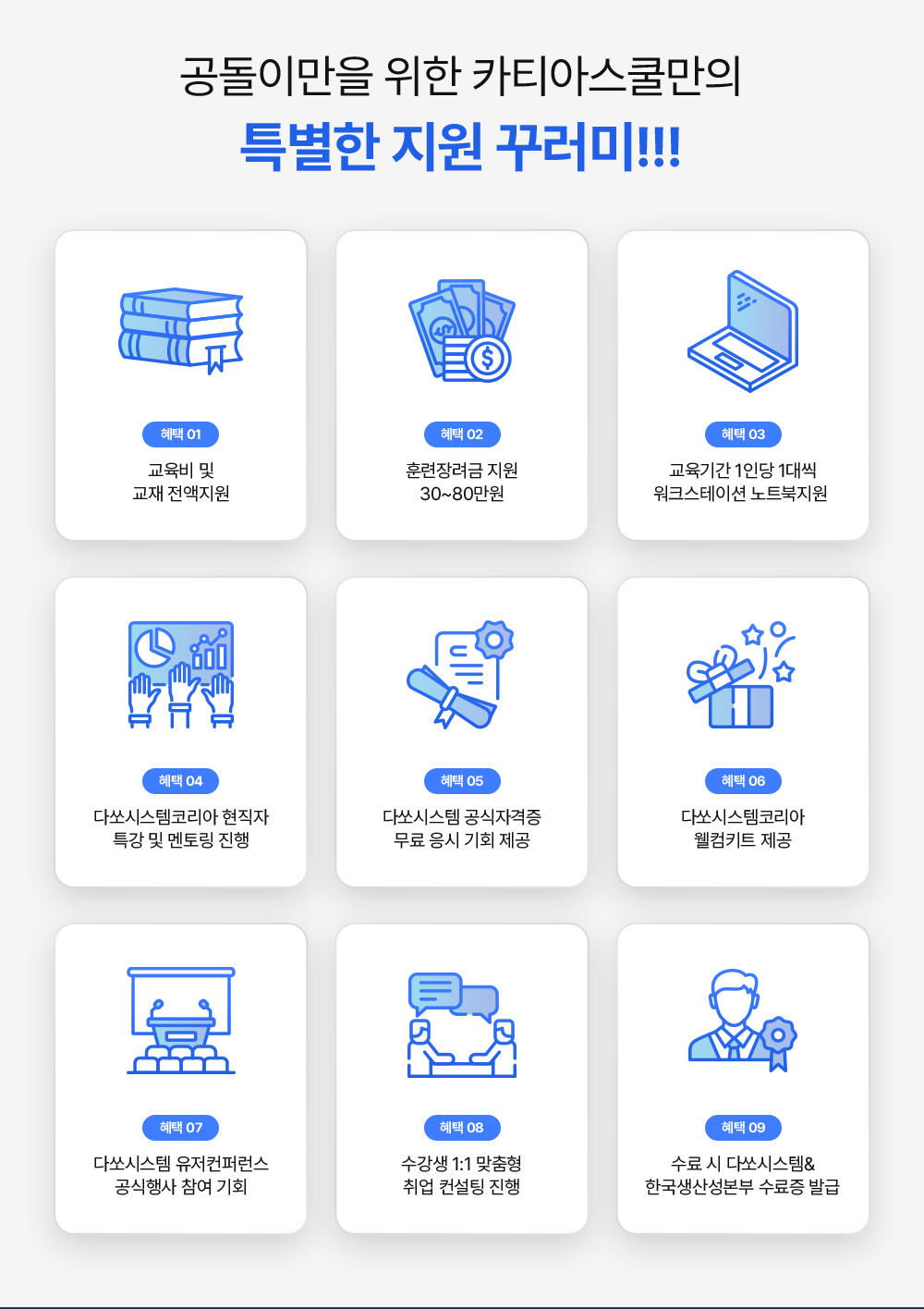 - 교육장소 : 카티아스쿨(서울시 금천구 가산디지털1로 146, 대륭테크노타원22차 1102호)
