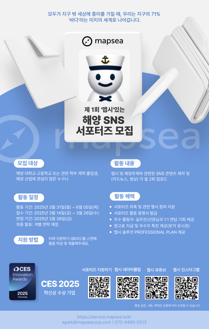 CES 2025 해양 분야에서 유일하게 혁신상을 수상한 해양 빅데이터 기업, 맵시에서 제 1회 해양 SNS 서포터즈를 모집합니다!