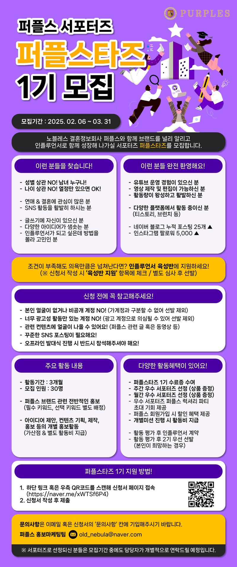 노블레스 결혼정보회사 퍼플스와 함께 브랜드를 널리 알리고 인플루언서로 함께 성장해 나가실 서포터즈 '퍼플스타즈'를 모집합니다.