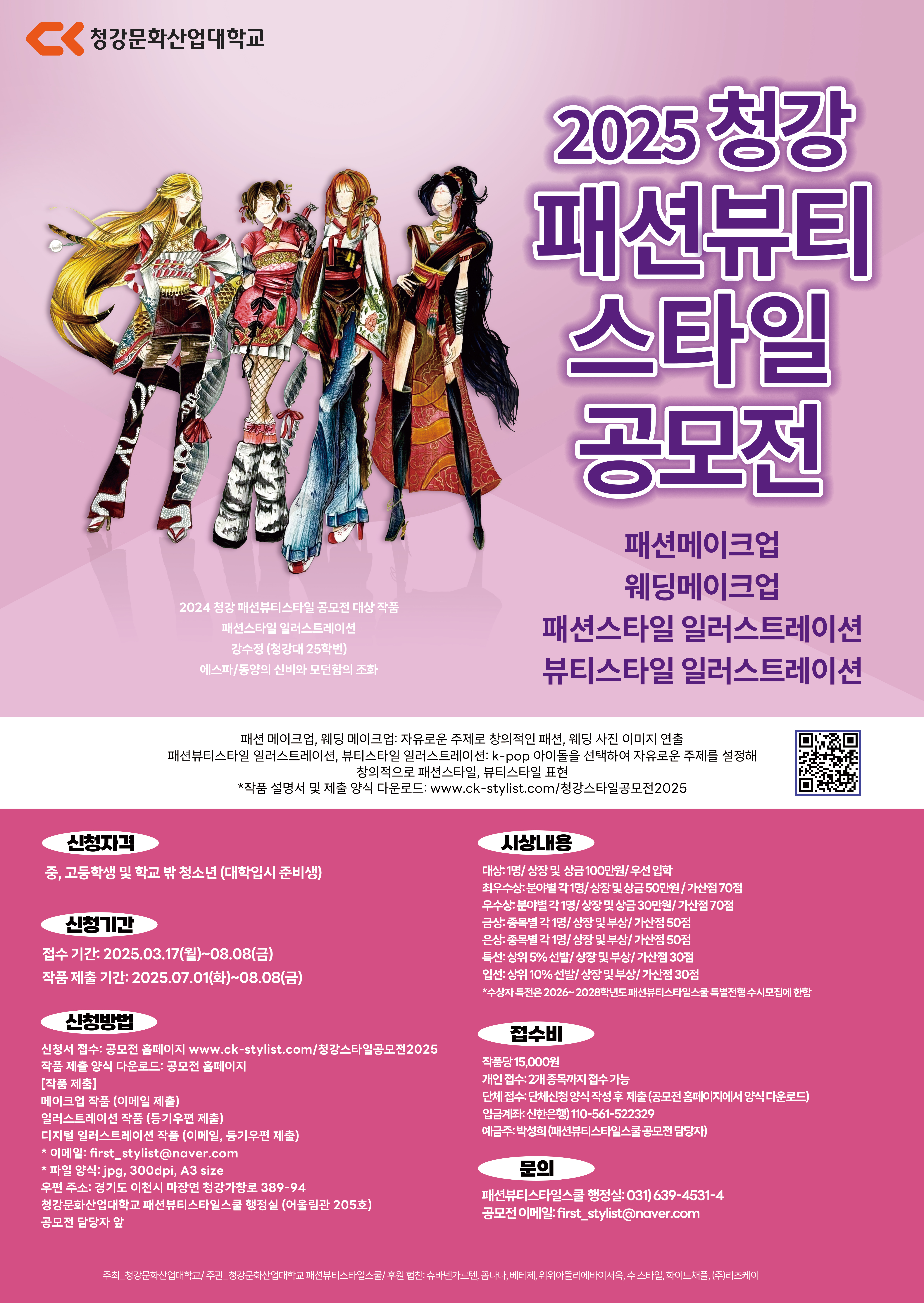 ◉ 참가신청 청강 패션뷰티스타일 공모전 홈페이지 www.ck-stylist.com/청강스타일공모전2025 개인신청: 신청서 접수 후 양식 다운로드 단체신청: 단체신청 양식 작성 후 이메일 (first_stylist@naver.com) ![]() ![]() | |||||