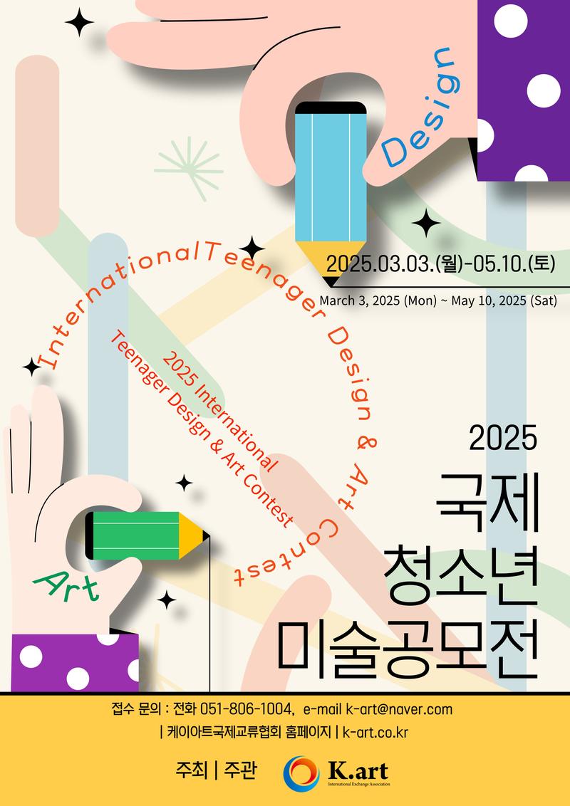 사단법인 케이아트국제교류협회에서 전 세계 청소년들이 창조적 예술 창의성을 펼칠 수 있는 기회를 제공하여 전 세계 다양한 문화 예술 교육을 직접 체험할 수 있는 학생 미술 문화 교류의 장으로 만들어 갈 제24회 2025국제 청소년 미술공모전을 개최하오니 많은 관심과 참여 바랍니다.