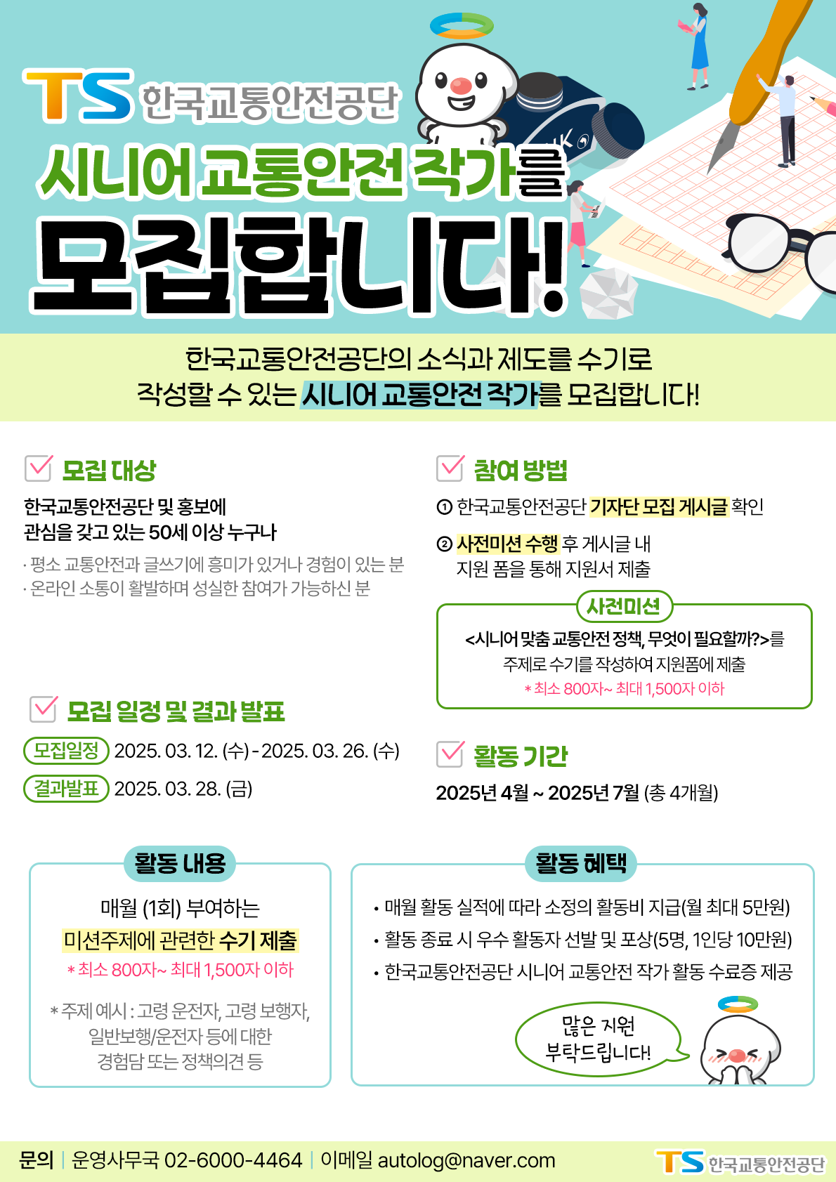 한국교통안전공단의 소식과 제도를 수기로 작성할 수 있는 시니어 교통안전 작가를 모집합니다!