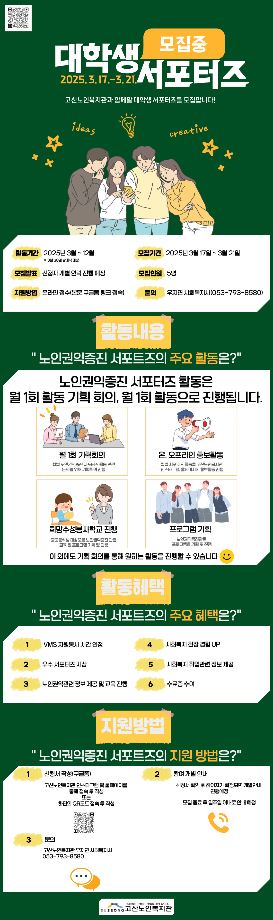 고산노인복지관에서는 전문적인 기획 및 진행 활동에 관심이 있는 대학생을 대상으로 노인권익증진 서포터즈 1기를 모집하고 있습니다!