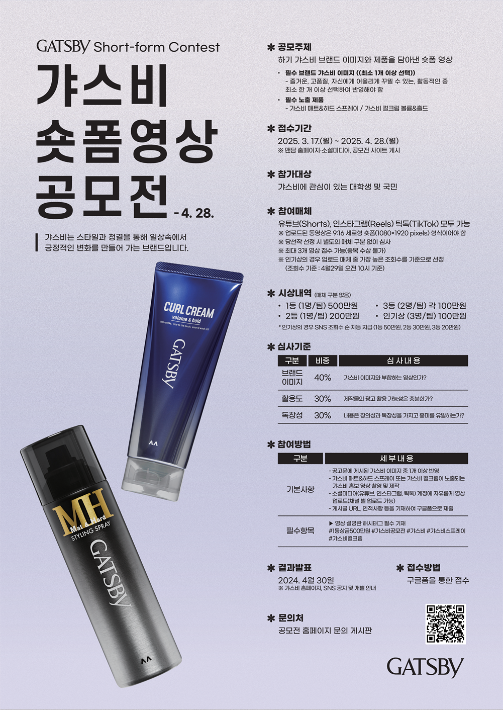접수기간 : 2025. 3. 17.(월) ~ 2025. 4. 28.(월) ※ 맨담 홈페이지·소셜미디어, 공모전 사이트 게시