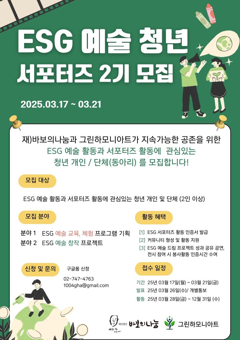 - ESG 가치를 담은 예술 활동 교육 및 체험 부스 운영 프로그램 기획형 서포터즈 활동