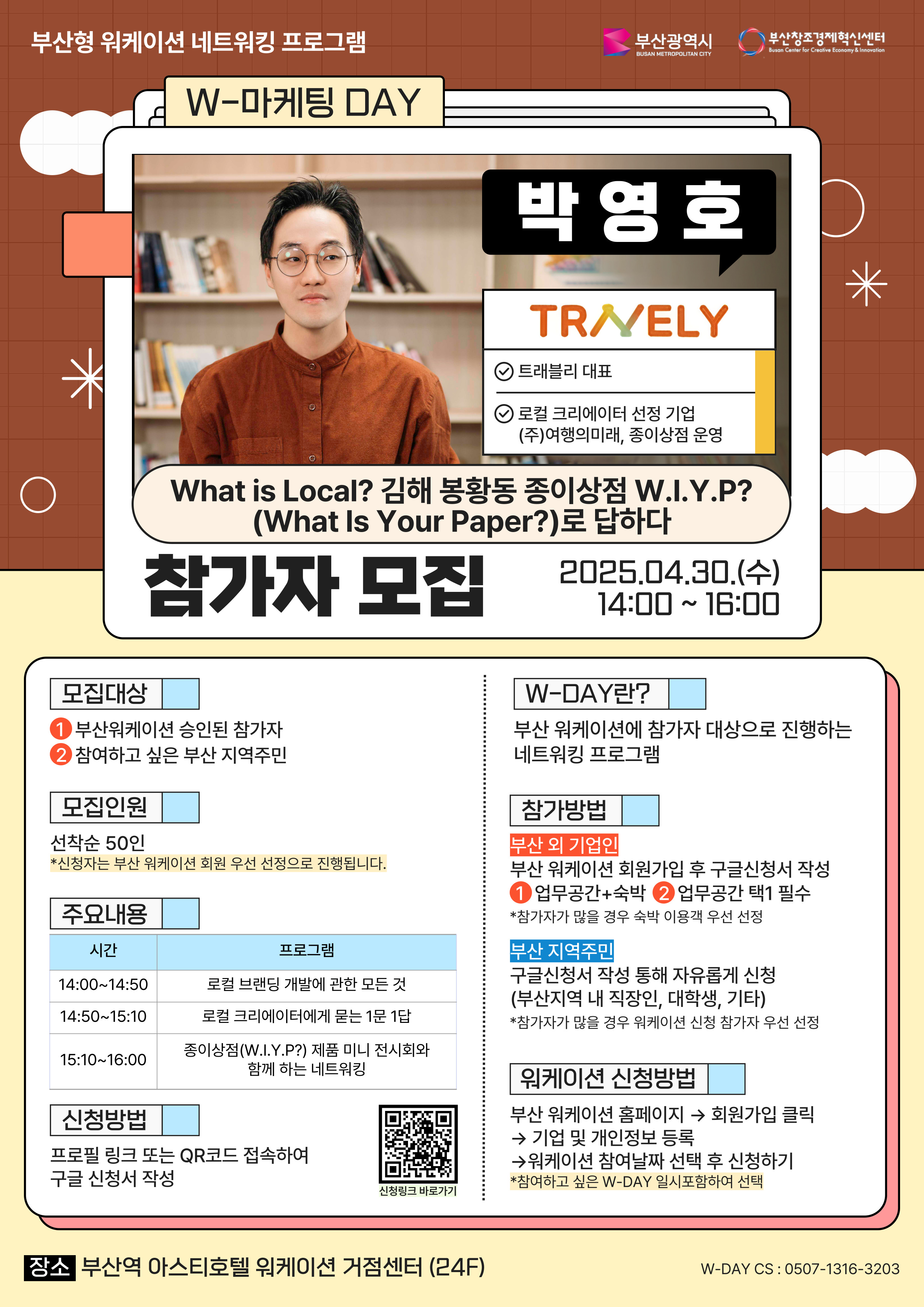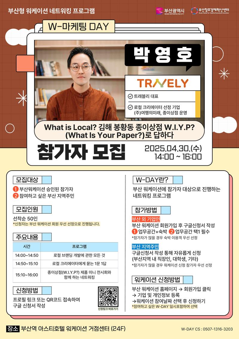 (주)여행의미래, 종이상점 운영자 트래블리 박영호 대표가 김해 봉황동에서 로컬 크리에이터로 자리 잡은 과정과 브랜딩 전략을 공유합니다! 로컬 크리에이터로서의 경험을 바탕으로 브랜드를 만들고 성장시키는 방법을 이야기하며, 참가자들의 질문에 직접 답하는 1문 1답 시간도 마련될 예정입니다. 또한, ‘종이상점(W.I.Y.P?)’ 제품 미니 전시와 함께 네트워킹이 진행되며, 로컬 브랜드의 가능성을 직접 경험하고 소통할 수 있는 특별한 시간이 될 것입니다!