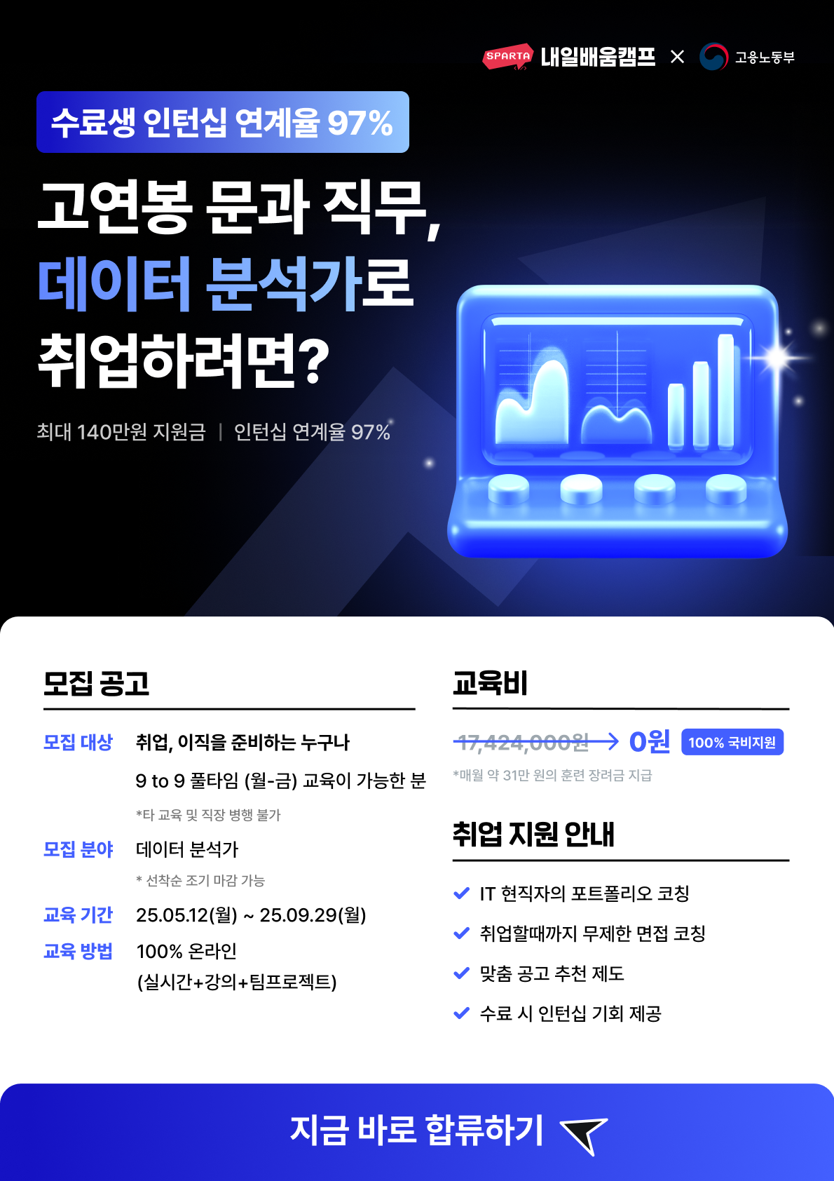 4개월 뒤, 데이터분석가로 취업 성공이 가능한 <데이터 분석 부트캠프> 7기 모집 시작되었습니다. ✨