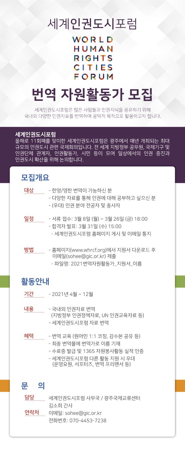 - 세계인권도시포럼 다른 활동 지원 시 우대 (운영요원, 서포터즈, 번역 프리랜서 등)
